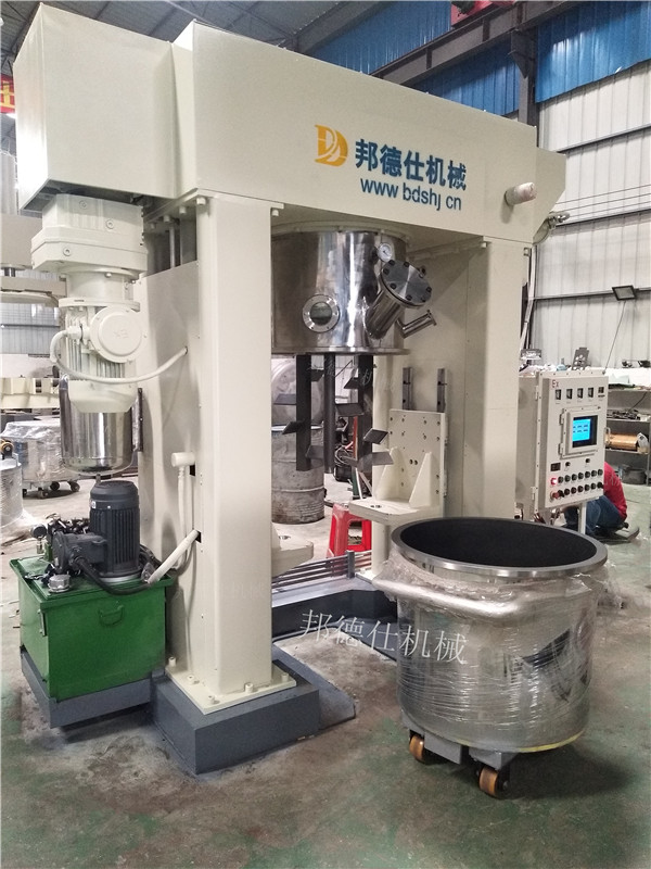 龍門架式行星動力混合機/多功能行星攪拌機是一種無死點的混合、攪拌、分散設備。此設備集行星機、強力分散機功能于一體,采用獨特攪拌機構,下料桶固定不動;分散盤、攪拌槳實現既公轉又自轉的行星運動,其速度可調頻變速。使物料作復雜運動,受到強烈的剪切、攪拌和搓合,物料得以充分混合和破碎。在釜內設計了自動刮壁、刮底結構,將粘附著釜壁上的物料刮下繼續混合,不會出現混合死角。設備密封獨特,可加壓或抽真空去氣泡等。您可以提出您所需要的處理量、設備形式、規格要求或您需要加工的物料的性質,邦德仕的銷售工程師會提供讓您滿意的方案。